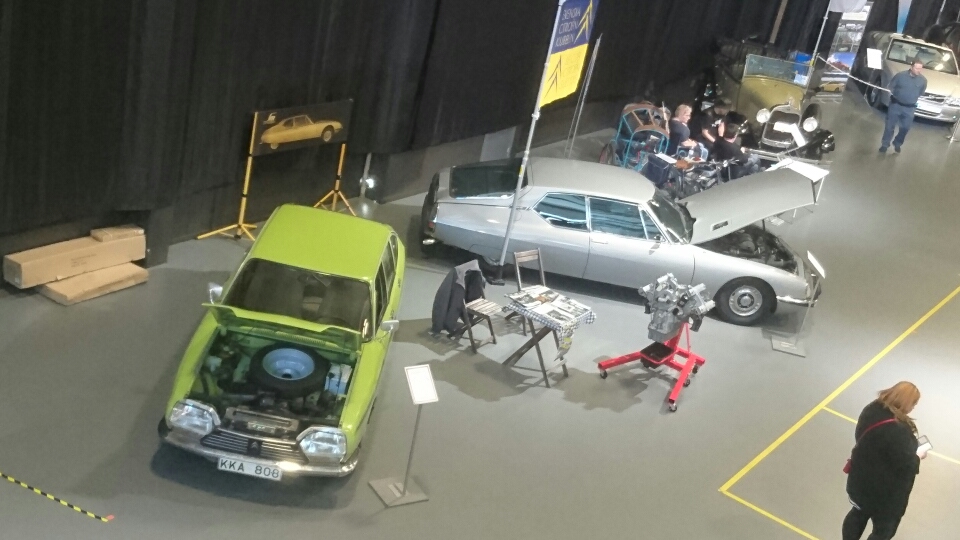 Arrangörer var tidningarna Gran Turismo, Klassiker och Moped. Temat var som förra året ”Från vrak till pärla” där allt från vackra ladufynd via pågående renoveringar till färdiga bilar ställdes ut – både superrenoveringar och orörda originalbilar. I verkstaden mitt i hallen kunde man följa intressanta projekt som växte fram under helgen. PÅ begränsad yta hade många intressanta och charmiga montrar gjorts i ordning och det fanns en del riktiga rariteter att se som exempelvis en Mazda Cosmo 1967 med Wankelmotor. Tidningen Moped bjöd på en fantastisk mopedkavalkad. I garaget under huvudhallen fanns en reservdels- och kuriosamarknad, där man även kunde hitta bilar till salu. SM-sektionen hade tänkt ställa ut en reservdelskaross som aldrig varit på vägen tillsammans med en renoverad insprutningsbil, men på grund av svårigheter med försäkringen fick det bli Fredrik Liws GS 79 med fint renoverad originalinredning. Dessutom tog vi med en Maserati C114, för i en SM IE ser man inte mycket av motorn. Vårt märke var väl representerat för Klassiker ställde ut Curt Nilemans DS cab och en Mehari tillhörande Lasse Lynxell hade klättrat upp i trappan. Publiken verkade bestå av motornördar med intresse och kunnande, så det blev ett par trevliga dagar med mycket informerande och kontaktskapande under klubbens flagga.